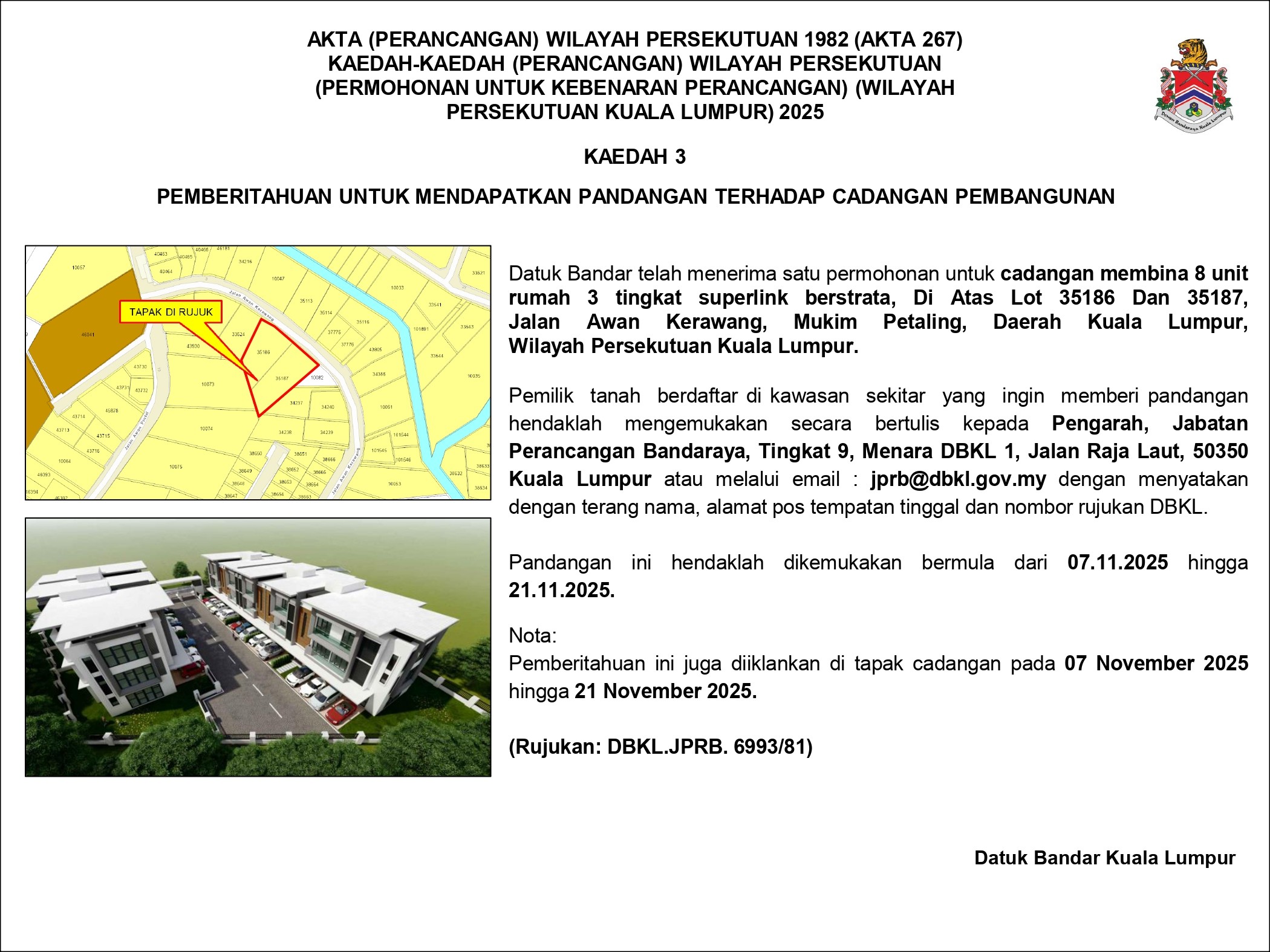 Home/Announcements/Hebahan Bagi Notis Pemberitahuan Untuk Mendapatkan Pandangan Pemilik Tanah Berdaftar Di Atas Lot 35186 Dan 35187, Jalan Awan Kerawang, Mukim Petaling, Daerah Kuala Lumpur, WPKL