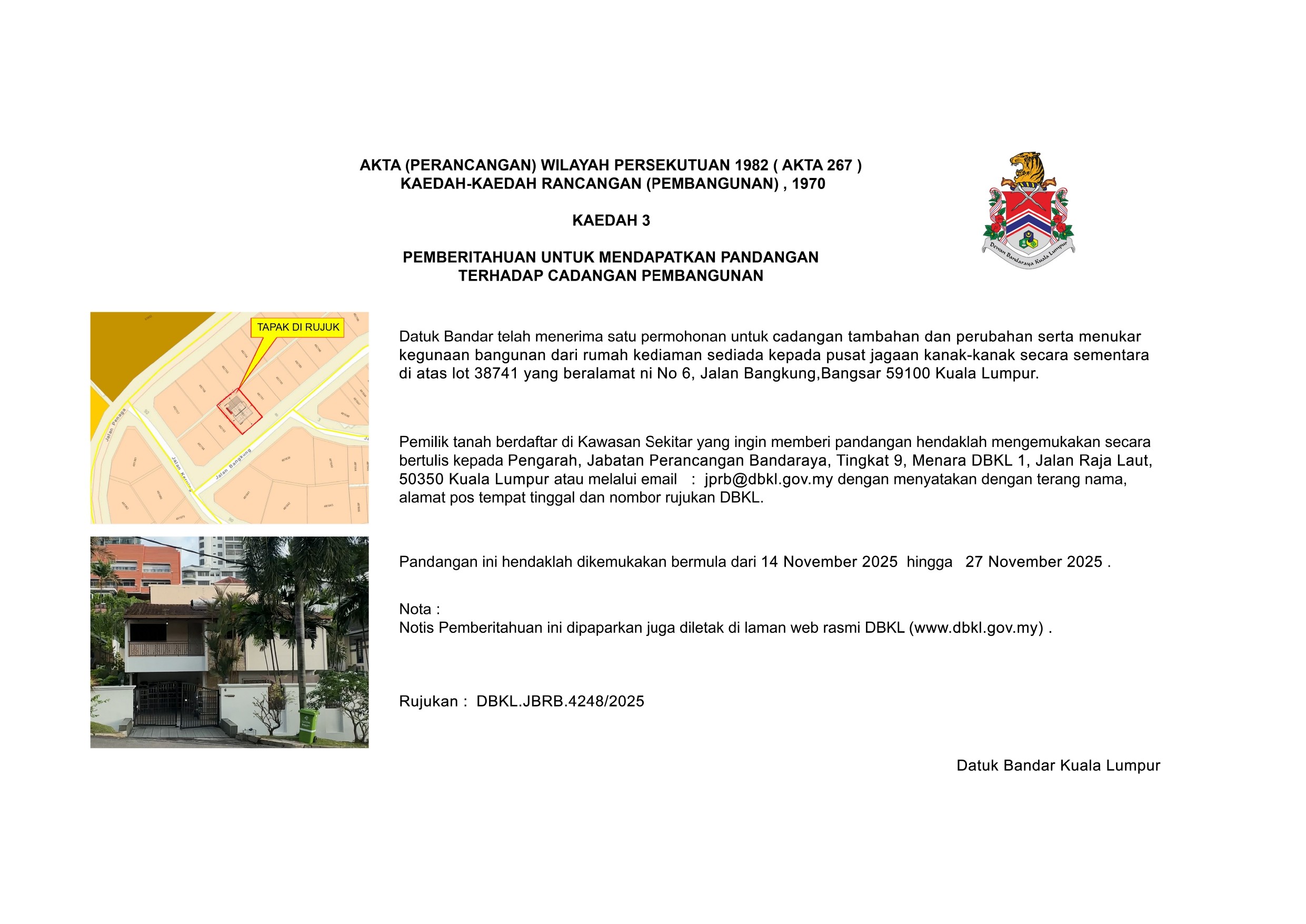 Home/Announcements/Hebahan Bagi Notis Pemberitahuan Untuk Mendapatkan Pandangan Pemilik Tanah Berdaftar Di Atas Lot 38741 Yang Beralamat Di No.6, Jalan Bangkung, Bangsar 59100 Kuala Lumpur