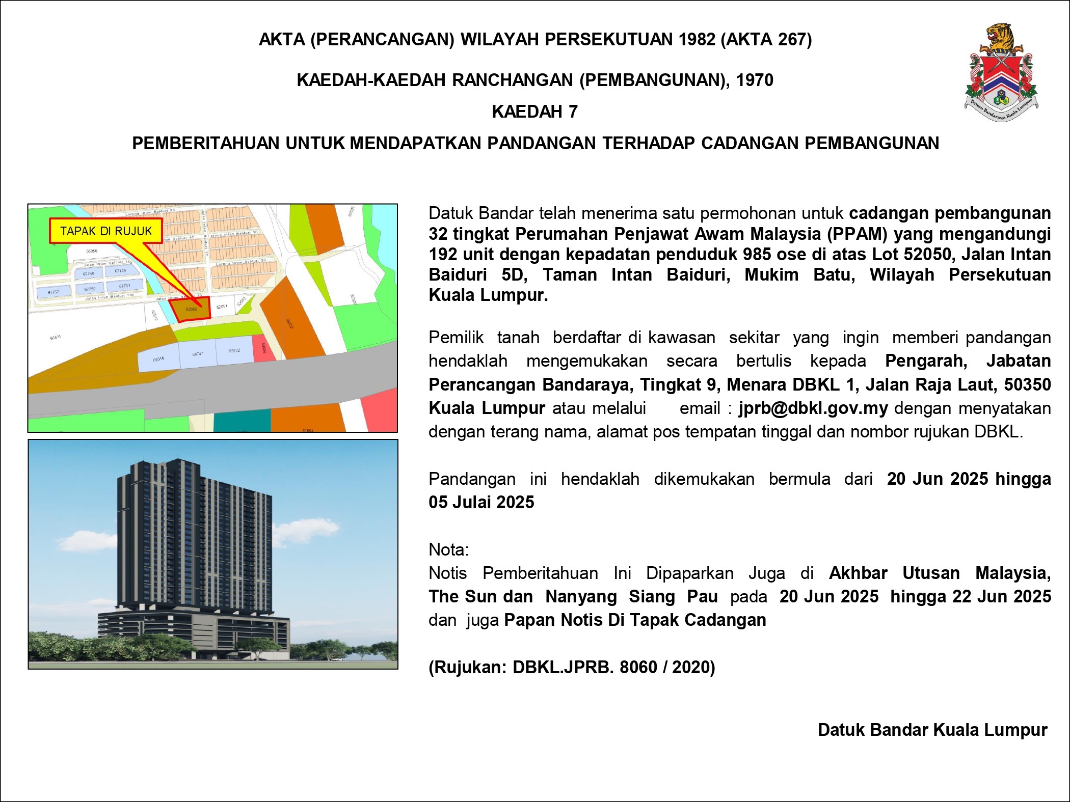 Home/Announcements/Hebahan Bagi Notis Pemberitahuan Untuk Mendapatkan Pandangan Pemilik Tanah Berdaftar Di Atas Lot 52050, Jalan Intan Baiduri 5D, Taman Intan Baiduri, Mukim Batu, Wilayah Persekutuan Kuala lumpur