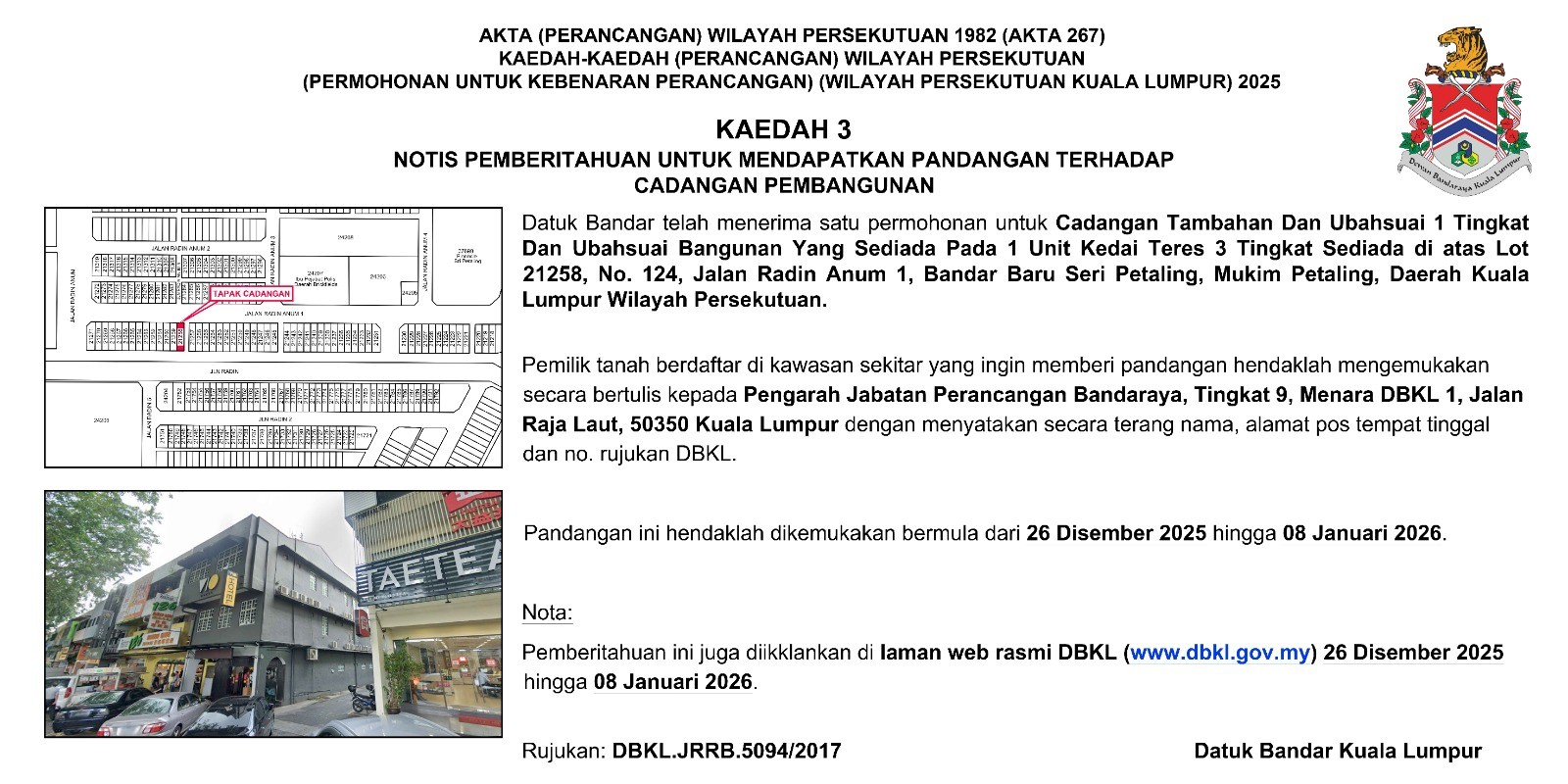Home/Announcements/Hebahan Bagi Notis Pemberitahuan Untuk Mendapatkan Pandangan Pemilik Tanah Berdaftar Di Atas Lot 21258, No. 124, Jalan Radin Anum 1, Bandar Baru Seri Petaling, Mukim Petaling, Daerah Kuala Lumpur Wilayah Persekutuan