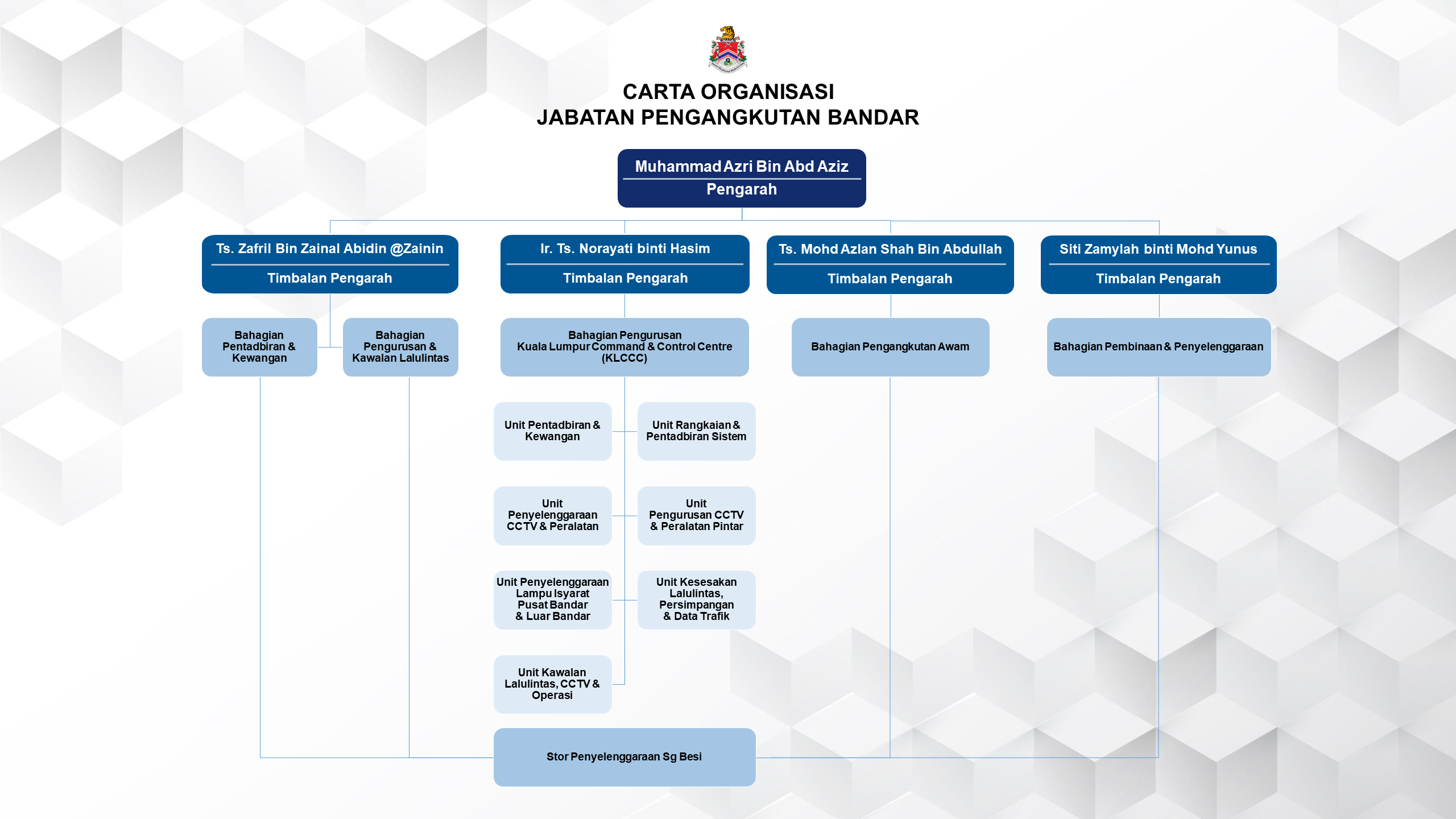 | 7 | Ts. Zafril Bin Zainal Abidin @Zainin | Timbalan Pengarah (J12) | 03-20282306 | zafril | - | Bahagian Pengurusan & Kawalan Lalulintas | - | Tingkat 8, Menara DBKL 2 |