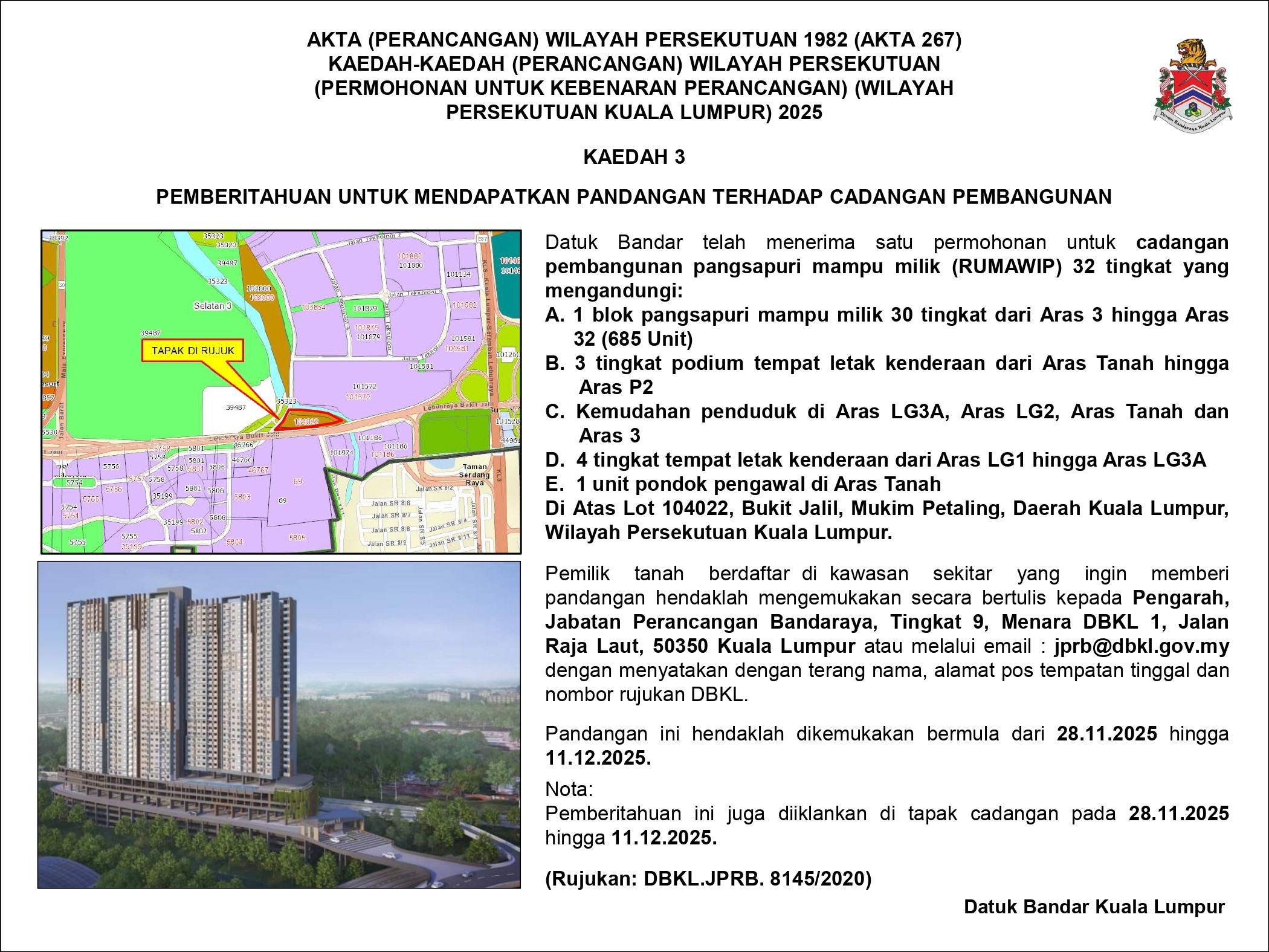 Utama/Pengumuman/Hebahan Bagi Notis Pemberitahuan Untuk Mendapatkan Pandangan Pemilik Tanah Berdaftar Di Atas Lot 104022, Bukit Jalil, Mukim Petaling, Daerah Kuala Lumpur, WPKL