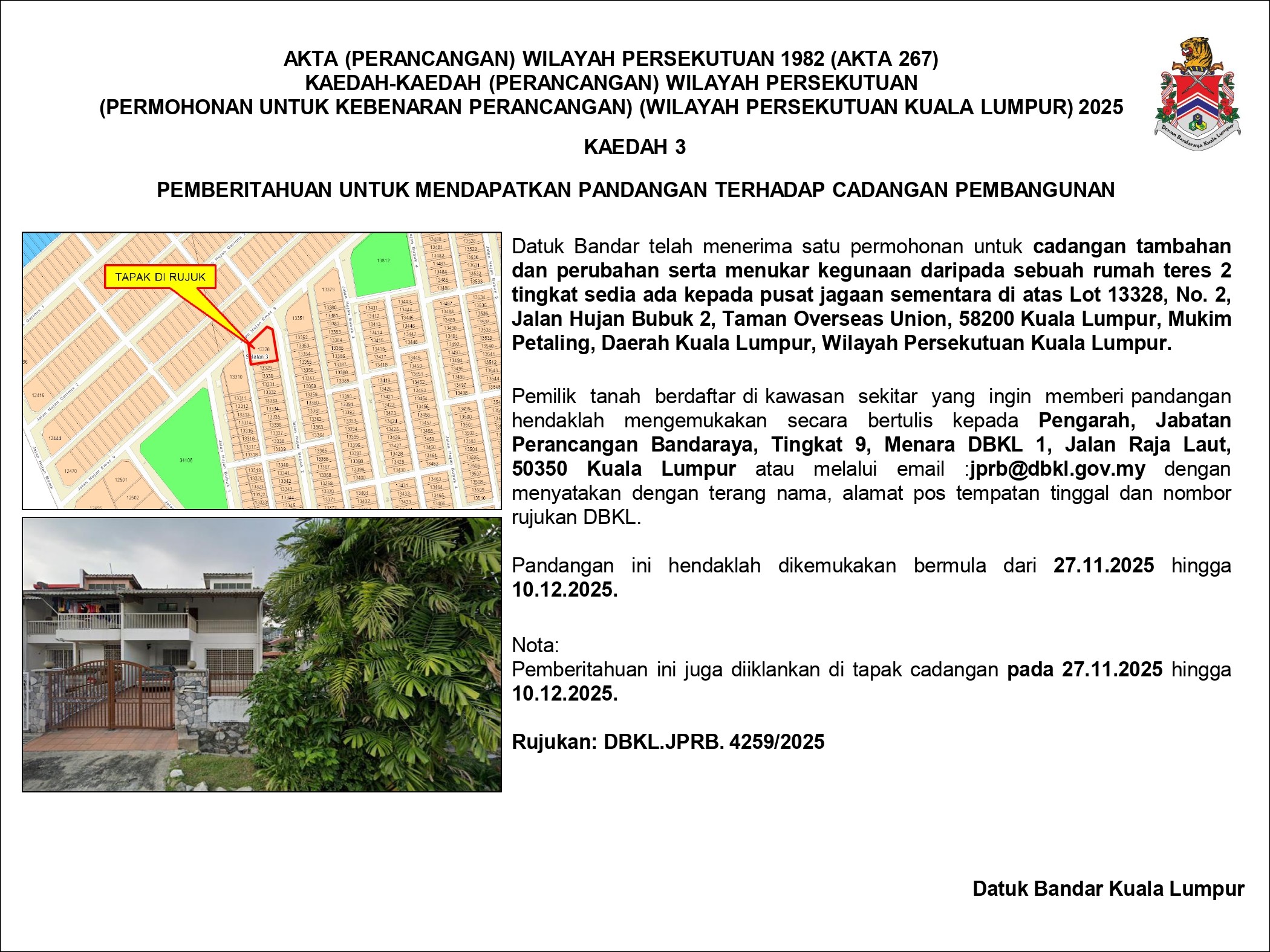 Utama/Pengumuman/Hebahan Bagi Notis Pemberitahuan Untuk Mendapatkan Pandangan Pemilik Tanah Berdaftar Di Atas Lot 13328, No.2, Jalan Hujan Bubuk 2, Taman Overseas Union, 58200 Kuala Lumpur, Mukim Petaling, Daerah Kuala Lumpur Wilayah Persekutuan Kuala Lumpur
