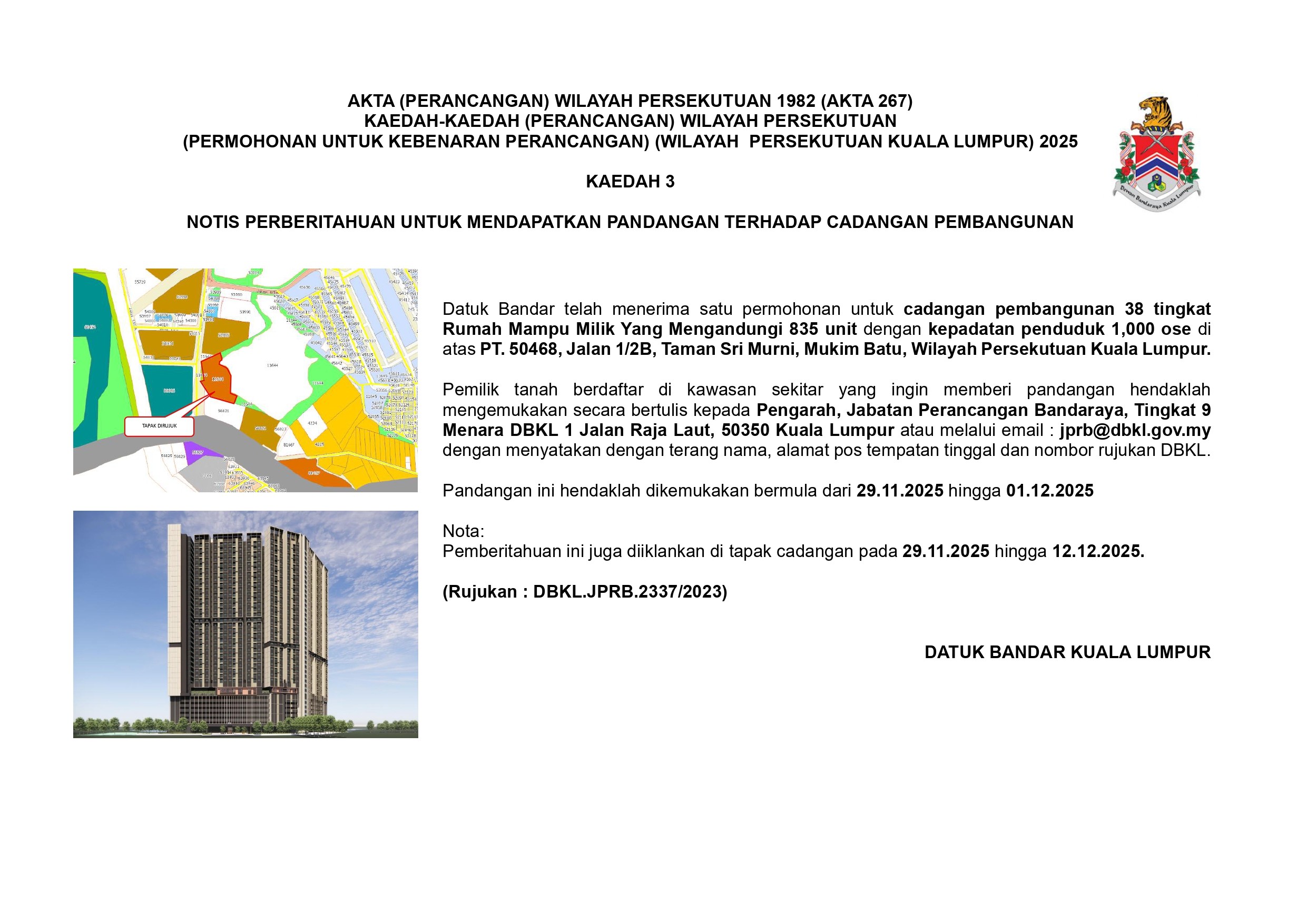 Utama/Pengumuman/Hebahan Bagi Notis Pemberitahuan Untuk Mendapatkan Pandangan Pemilik Tanah Berdaftar Di Atas Lot Pt. 50468, Jalan 1/2b, Taman Sri Murni, Mukim Batu, Wilayah Persekutuan Kuala Lumpur