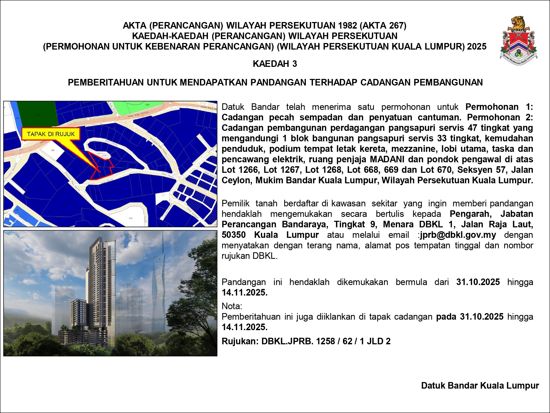 Utama/Pengumuman/Hebahan Bagi Notis Pemberitahuan Untuk Mendapatkan Pandangan Pemilik Tanah Berdaftar Di Atas Lot 1266, Lot 1267, Lot 1268, Lot 668, Lot 669 Dan Llot 670, Seksyen 57, Jalan Ceylon, Mukim Bandar Kuala Lumpur, Wilayah Persekutuan Kuala Lumpur